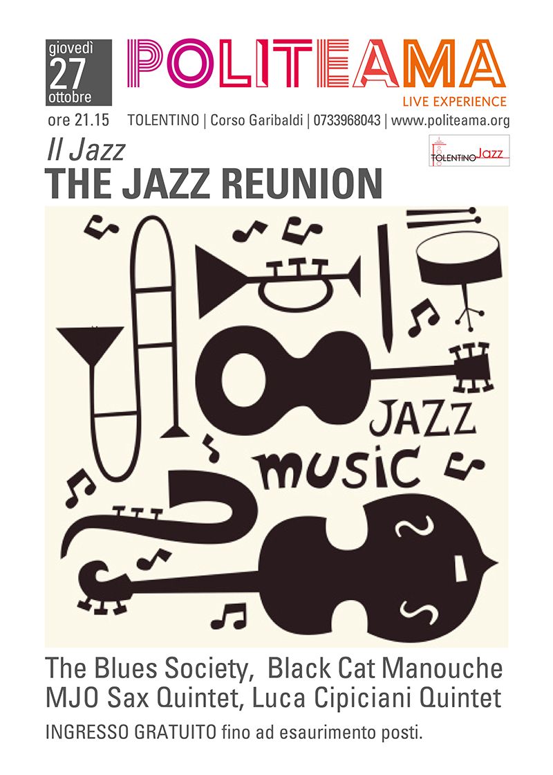 Tolentino – Dopo l’inaugurazione in grande stile con Modalità Trio (Massimo Moriconi, Ellade Bandini e Nico Gori), la stagione jazz del Politeama prosegue giovedì 27 ottobre alle 21,15 con “The Jazz Reunion”. L’evento, ad ingresso libero fino ad esaurimento dei posti, riunirà sul palco in un inedito concerto live musicisti provenienti da stili ed esperienze diverse che declineranno il jazz nelle sue diverse sfumature, spaziando dal blues al manouche, dallo swing al linguaggio autoriale moderno, senza dimenticare i tradizionali standard. La serata, organizzato dal Politeama di Tolentino in collaborazione con l’associazione Tolentino Jazz, sarà aperta da The Blues Society con Valter Vitali alla chitarra, Alessandro Santecchia, basso e voce e Massimo Raimondi alla batteria; di seguito ci saranno i Black Cat Manouche, formati da Giammarco Polini alla chitarra, Claudio Mangialardi al contrabbasso, Mauro Cimarra alla batteria e Giorgio Organtini al sax, che proporranno una serie di standard rivisitati nello stile di cui fu caposcuola Django Reinhardt. Sul palco del Politeama ci sarà anche il MJO Sax Quintet, ensemble di soli fiati capitanato da Stefano