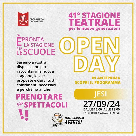 Pronta la 41° stagione teatrale per le nuove generazioni. Invito a tutti gli insegnanti all’𝗢𝗣𝗘𝗡 𝗗𝗔𝗬 dalle 15.00 alle 18.00 nell’ufficio di Teatro Giovani Teatro Pirata situato a Jesi (via […]