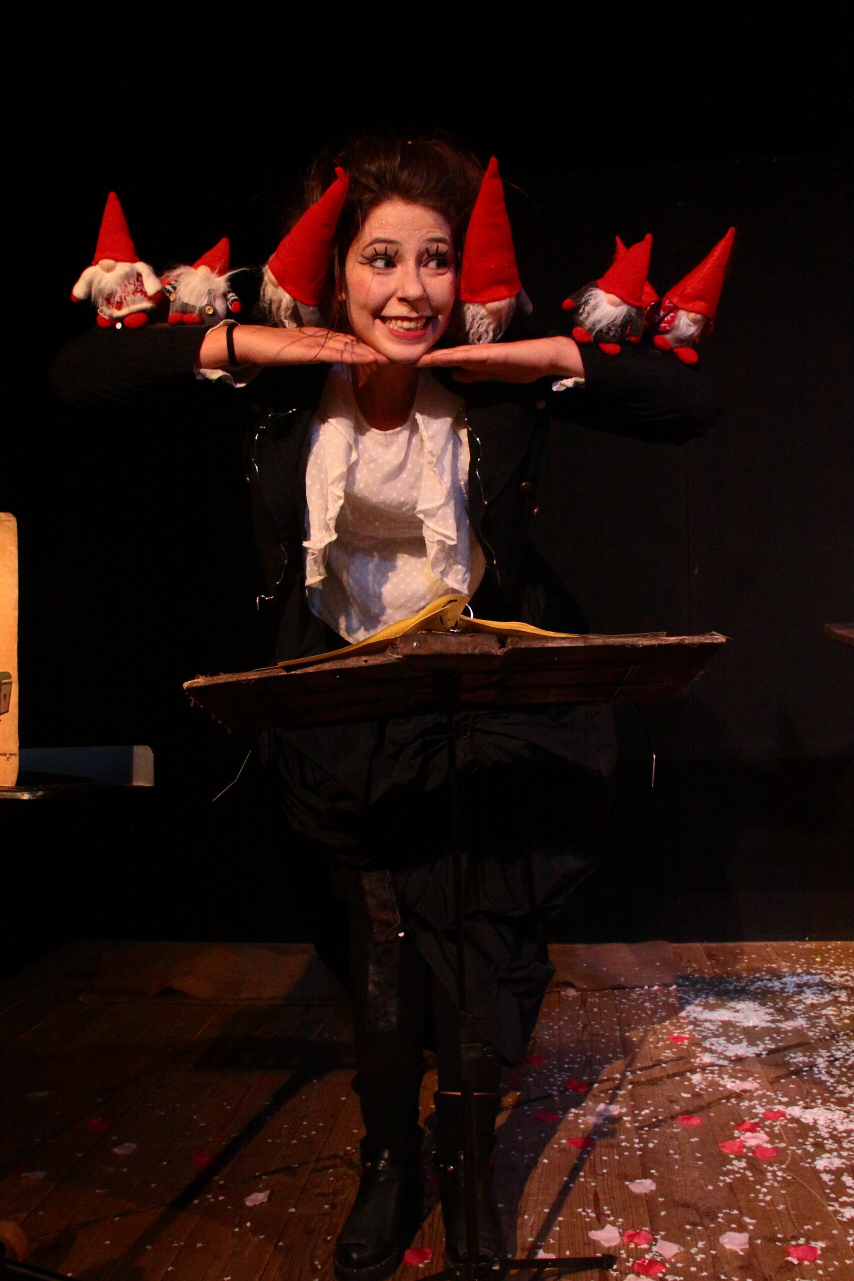 Olga, una buffa e pasticciona aspirante cantante cercherà di narrare, tra azioni comiche e poetiche, com’è nata la leggenda di Babbo Natale. Su un piccolo tavolo palcoscenico si ricostruirà il paesaggio innevato dove si svolge la vita degli Omini rossi. Ma che relazione ci sarà tra Babbo Natale e i piccoli Omini rossi? Olga sarà in grado di ricostruire la storia di un paese dove tutto è gelo e neve, un paese di laghi, boschi, colline chiusi nella morsa del gelo invernale dove vivevano i piccoli, rossi e divertenti personaggi? Sarà in grado di ricostruire le incredibili origini di Babbo Natale? Speriamo!