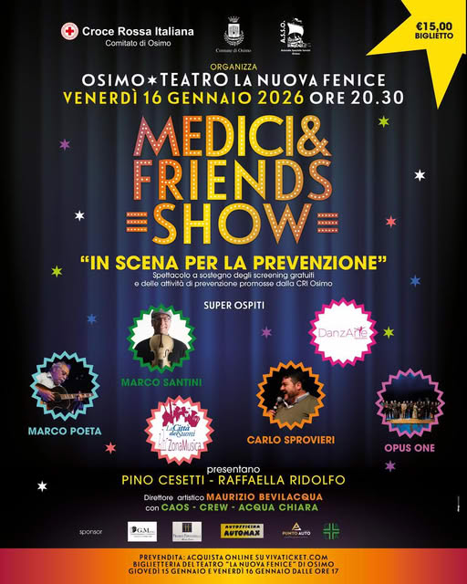 Medici & Friends Show, in scena per la prevenzione. Uno spettacolo all’insegna della solidarietà, in una splendida cornice, quella del teatro La Nuova Fenice di Osimo. Che vedrà la partecipazione di tantissimi musicisti e danzatori. Protagonisti tra gli altri anche l’Orchestra Zonamusica la città dei suoni, che sarà felice di aprire l’evento. Uno spettacolo a sostegno degli screening gratuiti e della attività di prevenzione promossa dalla CRI di Osimo. Venerdì 16 gennaio 2026, ore 20.30.
