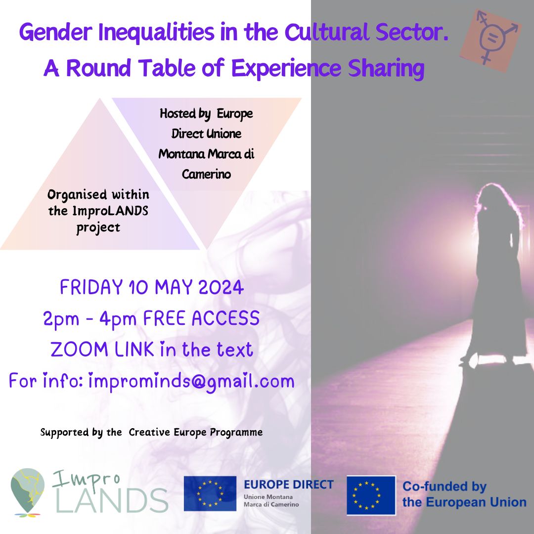 Il progetto europeo ImproLANDS e il nostro EUROPE DIRECT Unione Marca Camerino sono entusiasti di presentare l’evento “Gender Inequalities in the Cultural Sector. Round table of Experience Sharing” (“Le disuguaglianze di genere nel settore culturale: tavola rotonda di condivisione di esperienze”) che si terrà online il prossimo venerdì 10 maggio, dalle 14:00 alle 16:00.