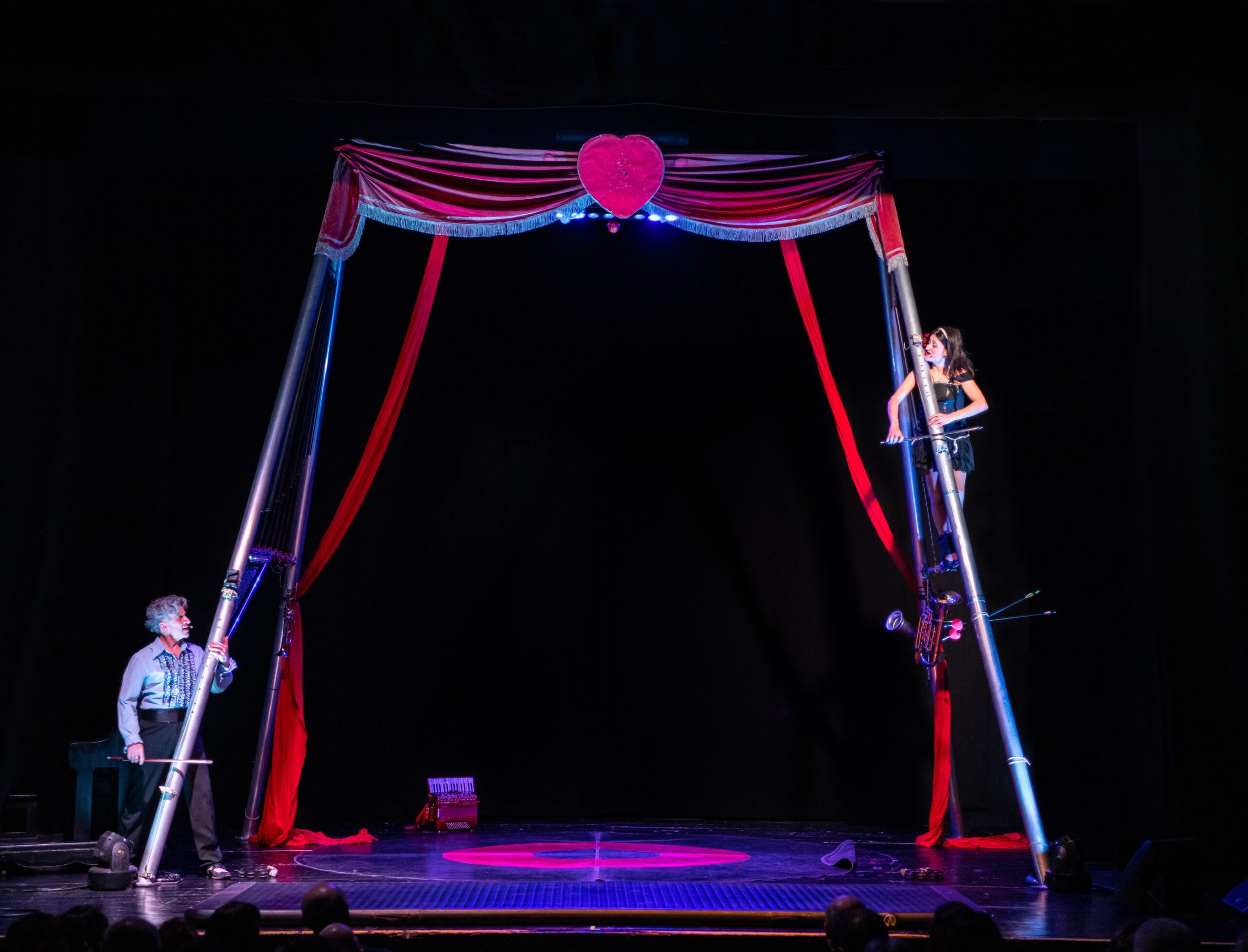 Nando e Maila hanno fatto una scommessa: giocare ai musicisti dell’impossibile, trasformando la struttura autoportante – dove sono appesi il trapezio e i tessuti aerei – in un’imprevedibile orchestra di strumenti.