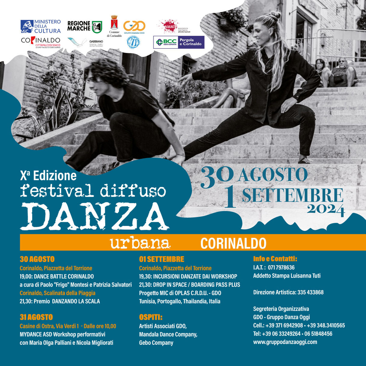 1) Nella mission del suo progetto Paesaggi Radici Comunità, il GDO trova nel Festival Danza Urbana e nella Call coreografica “Danzando la Scala”, particolare espressione ed esaltazione delle bellezze architettoniche-paesaggistiche e artistiche del Borgo. Corinaldo, come tanti altri luoghi storici d’Italia, deve il suo fascino e il suo mistero al saper coniugare tradizione e innovazione, radici e modernità, passato e futuro, in un intreccio di esperienze e vissuti che si chiamano l’un l’altro, come i gradini di una scala. Così La Piaggia, la storica scalinata al centro del Borgo, diventa per l’artista che vi performa un’occasione di “scendere” verso le radici di un territorio e di una Comunità pronti a raccontare di se o di “salire” verso il nuovo, la Danza, il movimento che diventa luogo, che diventa scala. Il Premio “Danzando la Scala” ha lo scopo di mettere in contatto le vibrazioni di un luogo “fermo” con l’energia del movimento creativo e diventare, insieme, performance. https://fb.me/e/tTln4H5gt