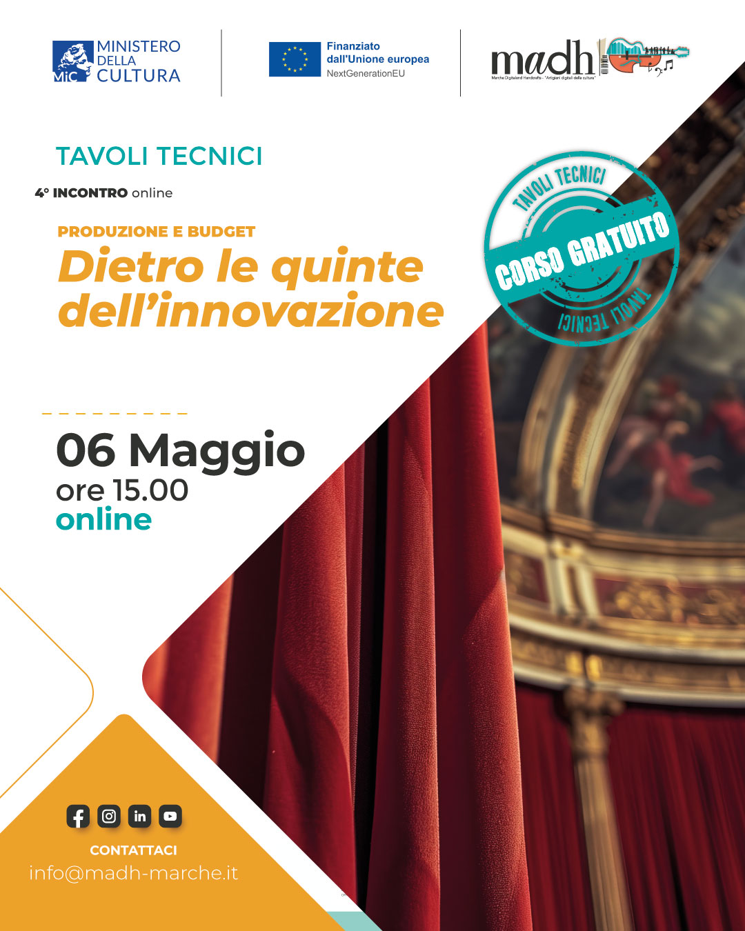 Entra nel vivo l’attività dei tavoli tecnici del progetto MADH Marche Digital and Handcrafts – Artigiani Digitali della Cultura: nel prossimo incontro ci dedicheremo al confronto e alla sperimentazione di strumenti utili alla gestione della produzione culturale. Parleremo di produzione, budget, gestione delle tournée e integrazione con sistemi di biglietteria.