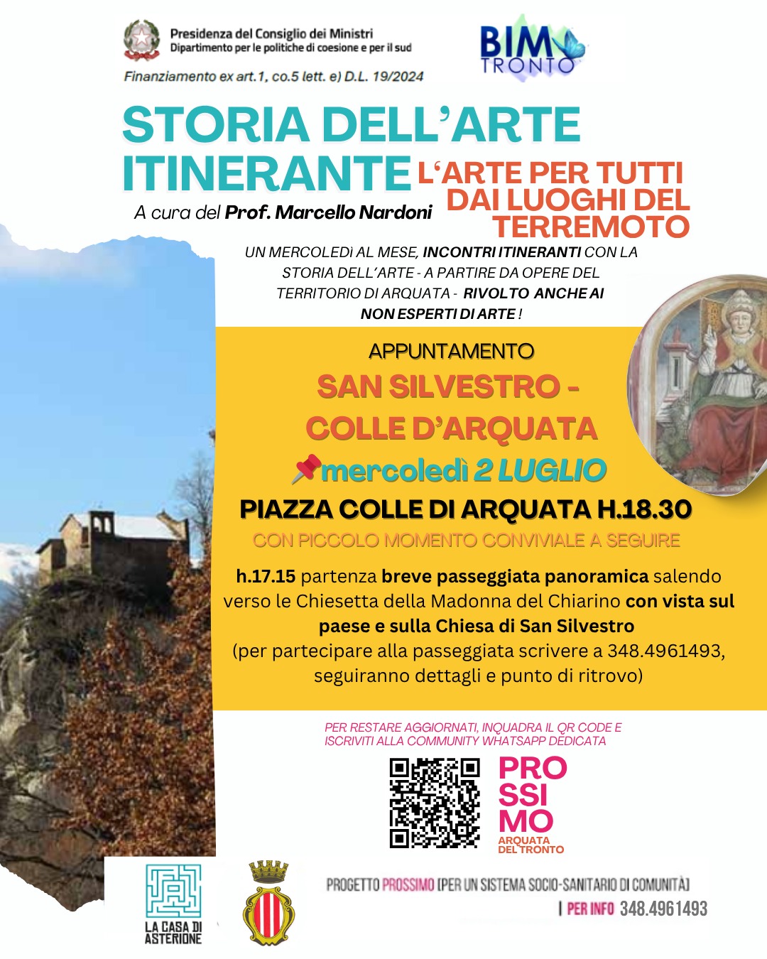 Le attività si inseriscono all’interno del progetto “ PROSSIMO: PER UN SISTEMA SOCIO-SANITARIO DI COMUNITA’ a cura di La Casa di Asterione, Bim Tronto – Bacino Imbrifero Montano del Tronto, Comune di Arquata del Tronto, Pro Loco Arquata del Tronto, con il supporto di associazioni del territorio come Associazione “Arquata Potest “ e finanziato dal Bim Tronto – Bacino Imbrifero Montano del Tronto con il contributo del Dipartimento per le politiche di coesione e per il sud della Presidenza del Consiglio dei Ministri.