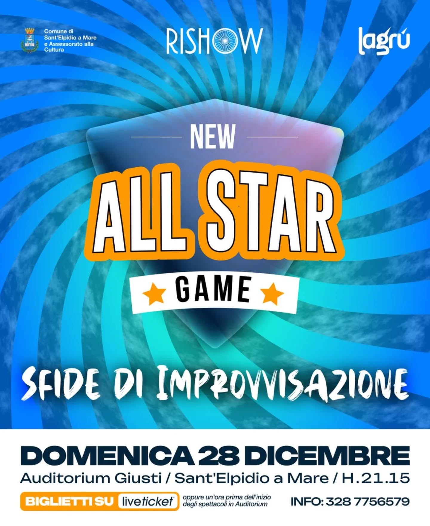 All Star Game è una vera e propria sfida a colpi di improvvisazione per una serata ad alto tasso di divertimento e stupore insieme alla compagnia RISHOW e alle musiche di Andriano Brando Alessandrini. Presentatrice della serata sarà Rebecca Liberati mentre alla parte tecnica ci sarà Marco Ferroni.