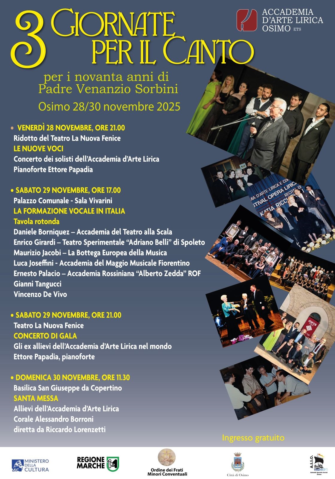 L’Accademia d’Arte Lirica Osimo ETS celebra il novantesimo compleanno di Padre Venanzio Sorbini, fondatore e guida spirituale dell’istituzione, con tre giornate dedicate alla musica, alla formazione vocale e ai talenti dell’Accademia.