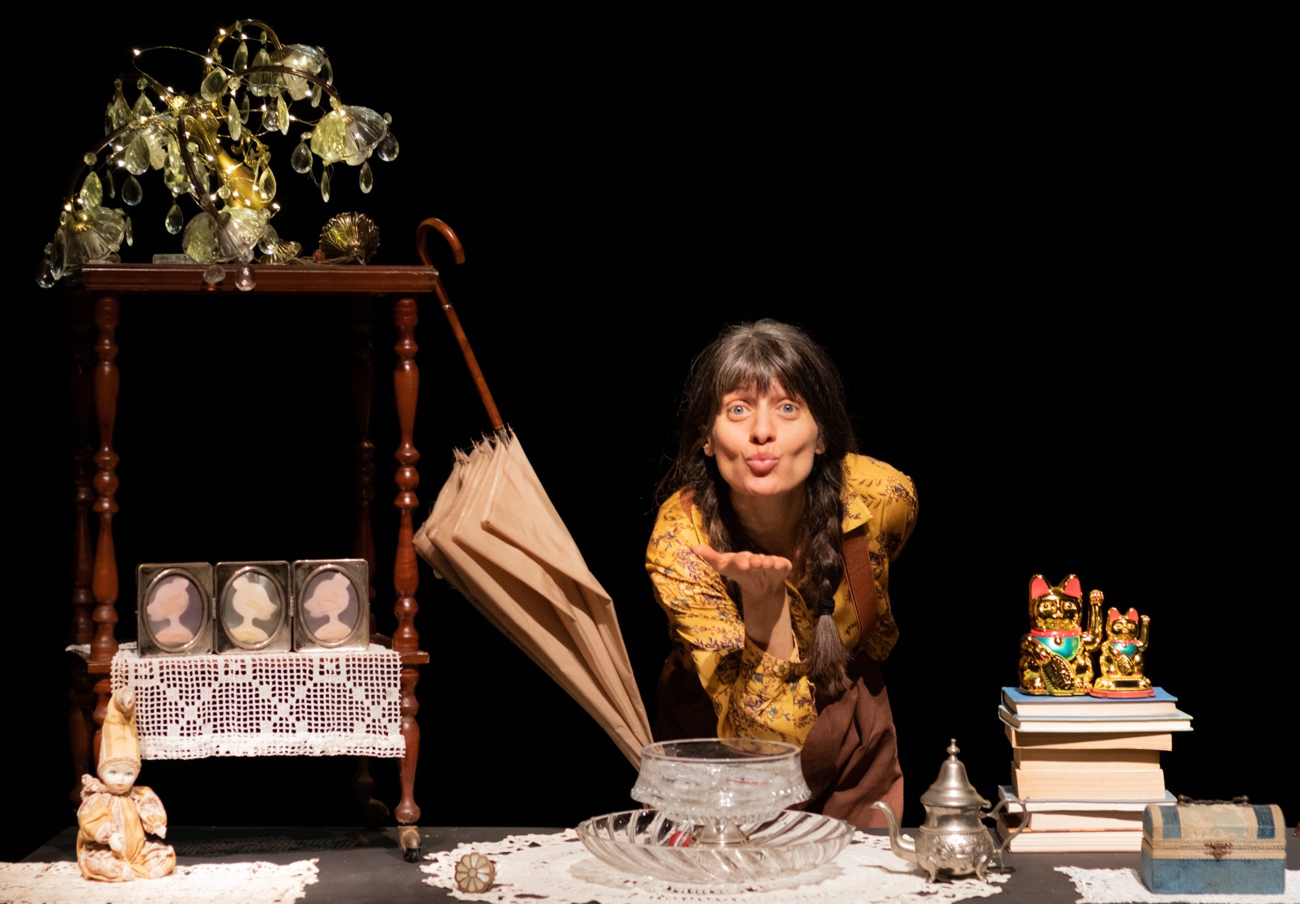 Non sempre i baci arrivano subito a destinazione, talvolta hanno bisognodi tempo, fanno il giro più largo. Succede così al bacio della buonanotte che una sera la mamma lancia al piccolo Luigi: la finestra è così vicina che il bacio se ne vola via e inizia un viaggio che durerà una vita intera. Luigi, infatti, lo ritroverà molti anni dopo,ormai adulto, forsevecchio, tra le cianfrusaglie di un mercatino dell’antiquariato. Ed è proprio il banchetto dell’usato il luogo in cui questa storia si fa scena: gli oggetti dimenticati che nessuno vuole più, illuminati da vecchi abat-jours e lampade malandate diventano via via i mondi e i personaggi di un’avventura leggera e profonda. Il gioco è quello di accennare, evocare appena situazioni e ambienti, attivare l’immaginazione dello spettatore, risvegliare in lui sensazioni, lasciare che emozioni lo attraversino, spostare lo sguardo oltre e vivere una nuova trasformazione del bacio, lungo la scia di un amore che non smette di propagare il suo messaggio.