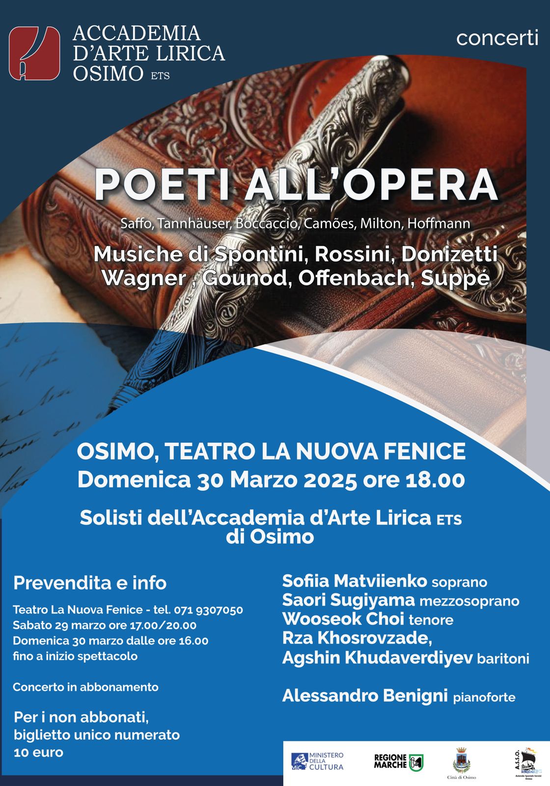 L’Accademia d’Arte Lirica di Osimo offre un nuovo appuntamento con musica e poesia, domenica 30 marzo alle ore 18.00 al Teatro La Nuova Fenice di Osimo. I solisti della storica istituzione cittadina, con il pianista Alessandro Benigni, propongono il concerto “Poeti all’opera” per presentare le figure letterarie protagoniste nell’opera lirica.
