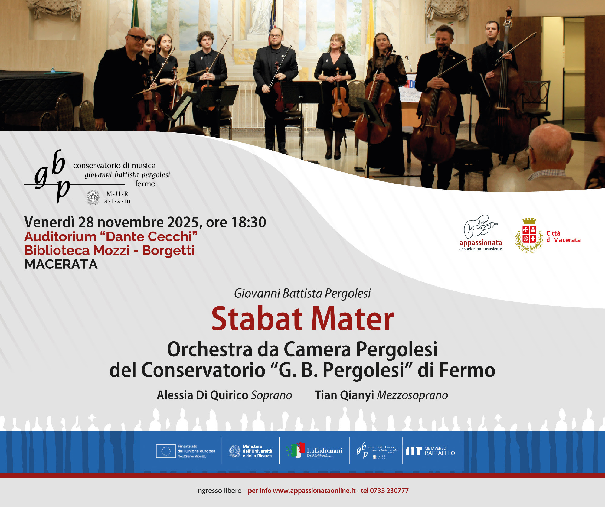 Il 28 novembre Appasionata ospiterà i giovani musicisti del Conservatorio “G.B. Pergolesi” di Fermo che, nell’ambito del progetto Metaverso Raffaello, eseguiranno anche a Macerata lo Stabat Mater di Pergolesi, uno dei vertici della musica sacra del Settecento. Un appuntamento che unisce lirismo e intensità in una pagina di profonda spiritualità e conferma la volontà di Appassionata di sostenere e dare spazio ai giovani talenti e rafforza la collaborazione con il Conservatorio di Fermo. Per maggiori info leggi qui