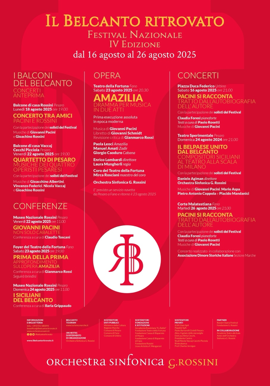 Sabato 23 agosto 2025, il Festival si sposta nel meraviglioso Teatro della Fortuna di Fano, dove alle ore 20.30 tornerà sulle scene, in prima esecuzione assoluta in epoca contemporanea, “Amazilia”, il melodramma di genere serio di Giovanni Pacini, con libretto di Giovanni Schmidt (che collaborò con Rossini, Mercadante, Donizetti, Spontini).