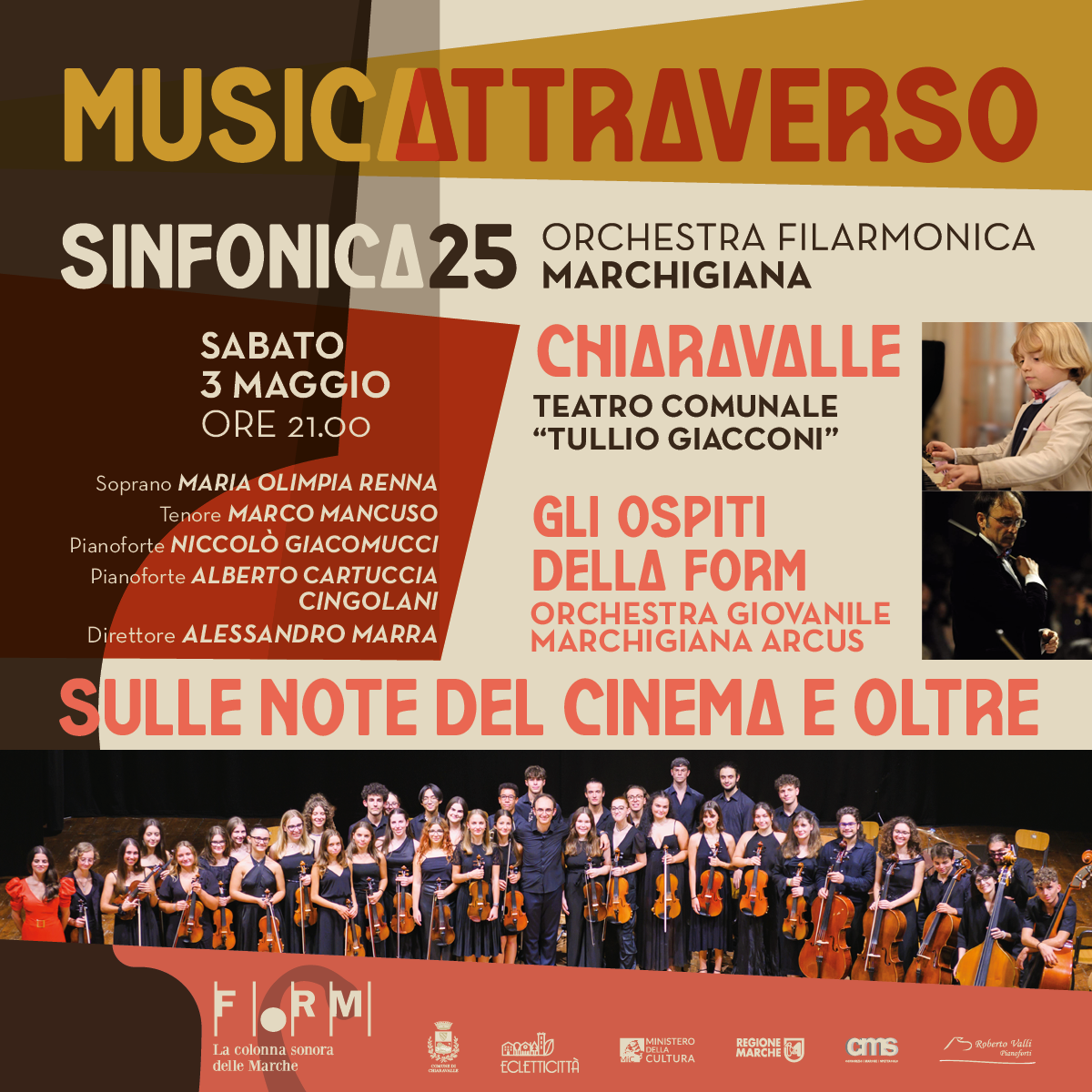 Appuntamento a Chiaravalle con Gli Amici della FORM. Sabato 3 maggio, alle ore 21, al Teatro Comunale Tullio Giacconi c’è l’Orchestra Giovanile Marchigiana Arcus, diretta da Alessandro Marra, componente della FORM, con il programma Sulle note del cinema…e oltre.