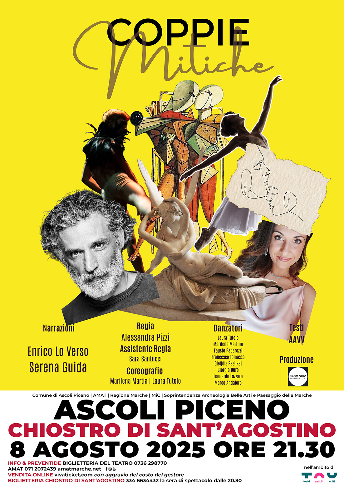 Ancora un appuntamento al Chiostro di Sant’Agostino ad Ascoli Piceno venerdì 8 agosto con Coppie mitiche, un affresco teatrale con Enrico Lo Verso e Serena Guida diretto da Alessandra Pizzi che attraversa il tempo e lo spazio, un intreccio di parole, musica e danza che dà nuova vita alle grandi storie d’amore della mitologia.